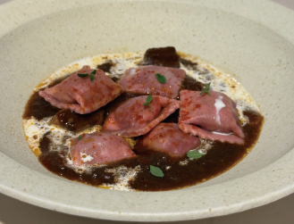 ●じゃがいものピュレを詰めたラビオリ 牛ほほ肉の赤ワイン煮込み :1,000 円(税込)
